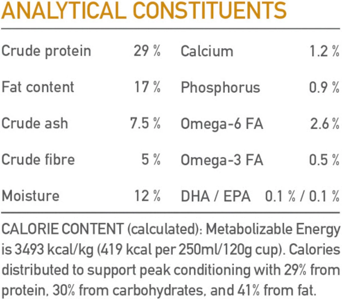 Analytische bestanddelen:Ruw eiwit 29 %, Ruw vet 17 %, Ruwe as 7.5 %, Ruwe celstof 5 %, Vocht 12 %, Calcium 1.3 %, Fosfor 1 %, Omega-6 vetzuren 2.6 %, Omega-3 vetzuren 0.5 %, DHA / EPA 0.1 % / 0.1 %. Glucosamine 1200 mg/kg. Chondroitine 900 mg/kg.