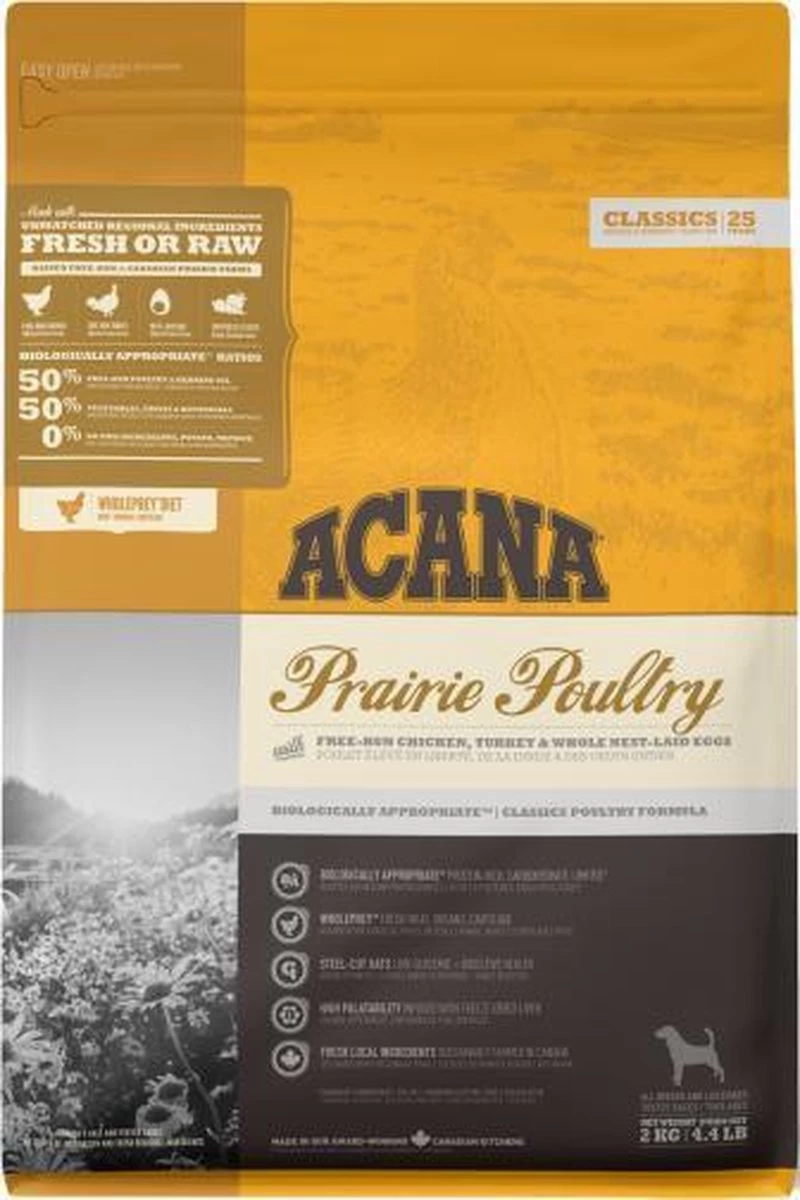 Acana Classics Prairie Poultry 11,4kg Acana Prairie Poultry is bereid van vrije uitloop kip en kalkoen, scharreleieren, dagelijks vers of rauw in Whole Prey? verhoudingen geleverd, van lokale prairie boerderijen. Vrij van hoge glycemische granen, is Acana rijk aan voedende vleeseiwitten en omega-3 vetzuren om topconditie te stimuleren.