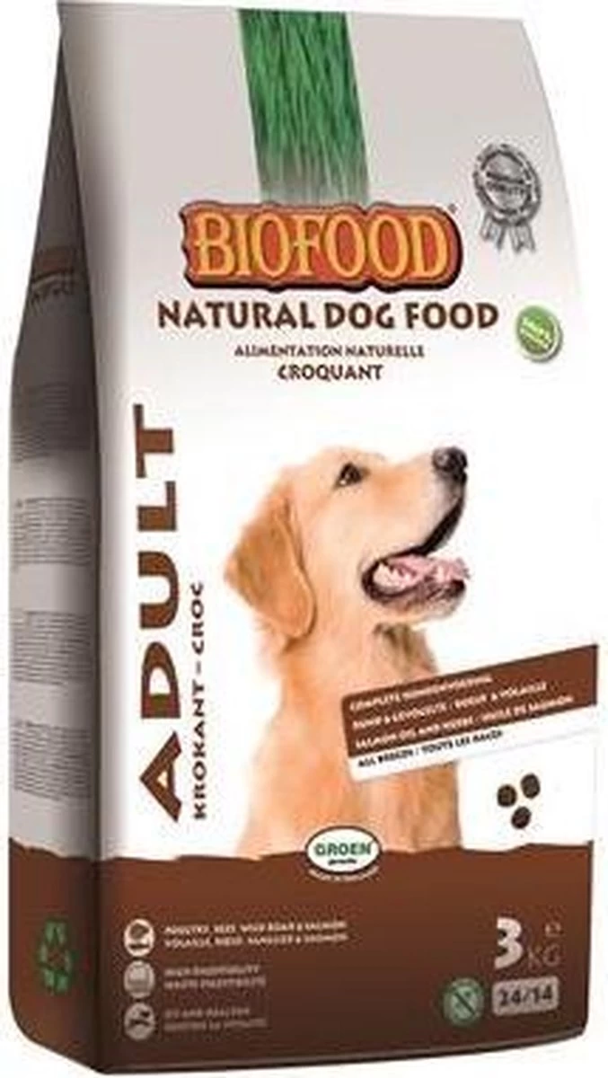 BIOFOOD Adult Krokant 12,5 kgBiofood Adult Krokant is een volledige licht verteerbare, natuurlijke en zeer smaakvolle hondenvoeding voor alle rassen. BIOFOOD Adult Krokant bevat gevogelte, rund, wild zwijn en zalm. Met zalmolie, schapenvet, rijst en kruiden. Tarwevrij. Hoge acceptatie en verteerbaarheid. Zalmolie met essentiële omega 3 vetzuren ondersteund huid, vacht, vitaliteit en weerstand. De toegevoegde echinacea kruiden ondersteunen het afweersysteem. De natuurlijke bronnen van eiwitten en vetten zijn van hoge kwaliteit. Deze zorgen voor een betere vertering, ontlasting en een goede conditie van uw hond. Voor alle hondenrassen. BIOFOOD Adult Krokant voeding kenmerken:-Nederlandse topkwaliteit.-hoogwaardige natuurlijke grondstoffen.-volledige licht verteerbare geëxtrudeerde hondenvoeding.-kip, rund, wild zwijn en zalm.-zalmolie en kruiden.-rijk aan Omega 3 & 6 vetzuren.-hoge acceptatie en verteerbaarheid.-zonder chemische toevoegingen.-voor volwassen honden.