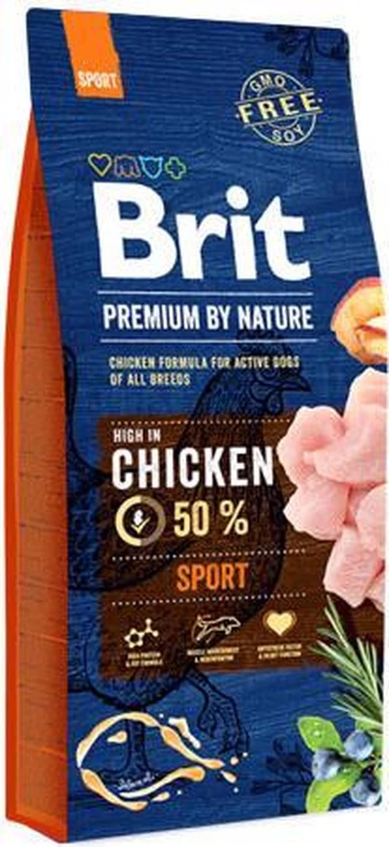 Brit Premium by Nature hondenvoer Sport 15 kg Brit Premium by Nature Sport is een volledig hondenvoer, op basis van kip, en geschikt voor volwassen honden met een hoog energieverbruik. Wat zijn de voordelen van Brit Premium by Nature hondenvoer Sport? – Eiwit- en vetrijke formule – Voeding & herstel van spieren – Anti-stress factor & hartfunctie SAMENSTELLING: kip 50 % (gedehydreerde 30 %, ontbeend 20 %), haver, kippenvet (geconserveerd met tocoferolen), tarwe, maïs, zalmolie (2 %), gehydrolyseerde kippenlever, bakkersgist, gedroogde appels, collageen, schaaldierschalen (een bron van glucosamine, 260 mg/kg), kraakbeen (een bron van chondroïtine, 180 mg/kg), kruiden en vruchten (kruidnagels, citrus, rozemarijn, kurkuma, 150 mg/kg), mannan-oligosachariden (150 mg/kg), fructo-oligosachariden (100 mg/kg), Mojave-yucca (100 mg/kg), gedroogde kamille (90 mg/kg), groene lipped mosselen (een bron van glycosaminoglycan, 60 mg/kg), gedroogde bosbessen (60 mg/kg). VOEDINGSADVIES: kan droog worden gegeven of bevochtigd met lauw water. geschikt voor honden met een hoog energieverbruik – de aanbevolen dagelijkse hoeveelheid voer die in de voedingstabel vermeld staat, moet worden verdeeld over een aantal kleinere porties afhankelijk van de inspanning van de hond – pas de dagelijkse verhouding aan de activiteit aan. De aanbevolen dagelijkse hoeveelheid staat vermeld in de voedingstabel. Geef kleinere hoeveelheden en vermeng met het vorige voer wanneer Brit Premium voor de eerste keer wordt gegeven; verhoog geleidelijk de hoeveelheid Brit Premium. Zorg ervoor dat er altijd voldoende schoon water klaarstaat voor uw hond. ANALYTISCHE BESTANDDELEN: ruw eiwit 31,0 %, vetgehalte 22,0 %, vochtgehalte 10,0 %, ruwe as 7,0 %, ruwe celstof 1,5 %, calcium 1,5 %, fosfor 1,1 %, omega-3-vetzuur 0,25 %, omega-6-vetzuur 2,5 %. NUTRITIONELE TOEVOEGINGSMIDDELEN PER 1 KG: vitamine A (3a672a) 20.000 IE, vitamine D3 (E671) 1200 IE, vitamine E (α-tocoferol) (3a700) 500 mg, biotine (3a880) 0,6 mg, cholinechloride (3a890) 600 mg, zinkchelaat van aminozuren, gehydrateerd (3b606) 90 mg, ijzer(II)chelaat van aminozuren, gehydrateerd (E1) 80 mg, mangaanchelaat van aminozuren, gehydrateerd (E5) 35 mg, kaliumjodide (3b201) 0,65 mg, koper(II)chelaat van aminozuren, gehydrateerd (E4) 15 mg, organische vorm van seleen, geproduceerd door Saccharomyces cerevisiae CNCM I-3060 (3b8.10) 0,2 mg. Bevat door de EU goedgekeurde antioxidanten: tocoferolextracten van plantaardige oliën (1b306), ascorbylpalmitaat (1b304) & rozemarijnextract. METABOLISEERBARE ENERGIE: 4 200 kcal/kg. Voedingstabel: Lichaamsgewicht van hond (kg) 5 10 15 20 25 30 40 50 60 70 80 90 Regelmatige activiteit (g) 60 110 140 180 210 250 310 360 410 460 520 570 Extreme activiteit (g) 70 130 180 210 250 280 350 420 480 530 570 620