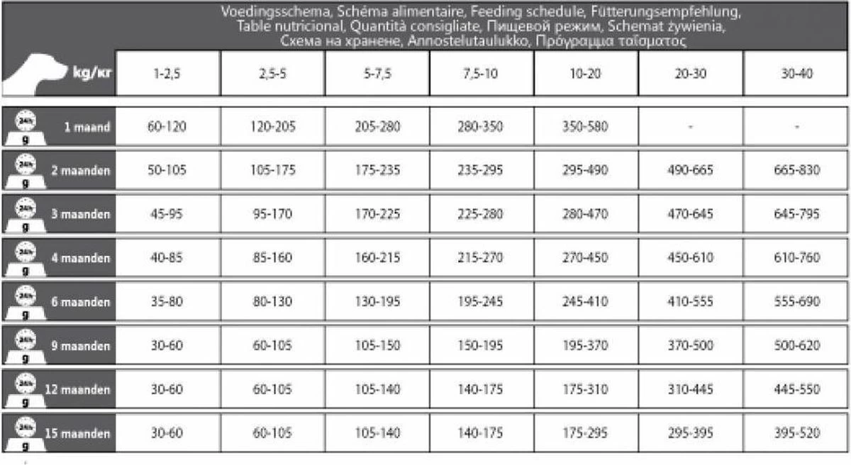 Puppy’s van grote rassen groeien door tot 15 maanden. Schakel na 15 maanden geleidelijk over naar CaroCroc Large Breed.