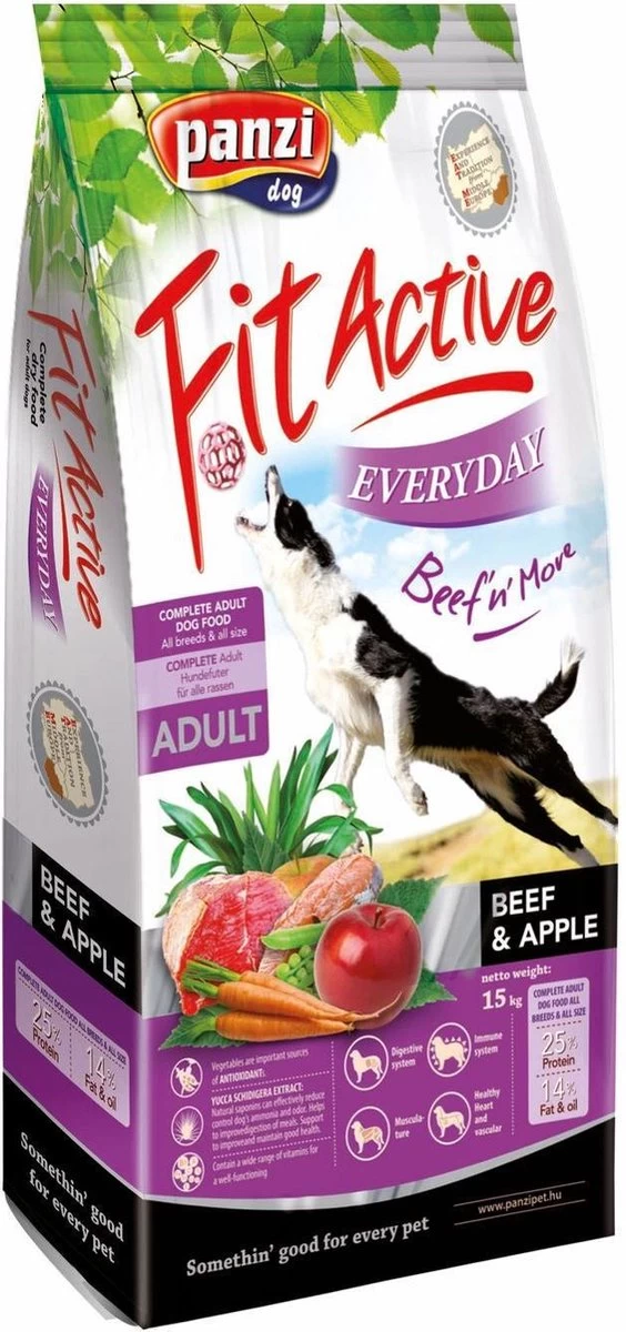 De Fit Active Everyday is een premium droge voeding voor volwassen honden met een normale activiteit. De kip/rund smaak zorgt voor een hoge acceptatie, zodat ook jouw hond van deze brok zal smullen. Daarnaast zorgt de kleine hoeveelheid vis voor een glanzende vacht! Door zijn platte brokvorm is deze brok geschikt voor middelgrote tot grote honden.
