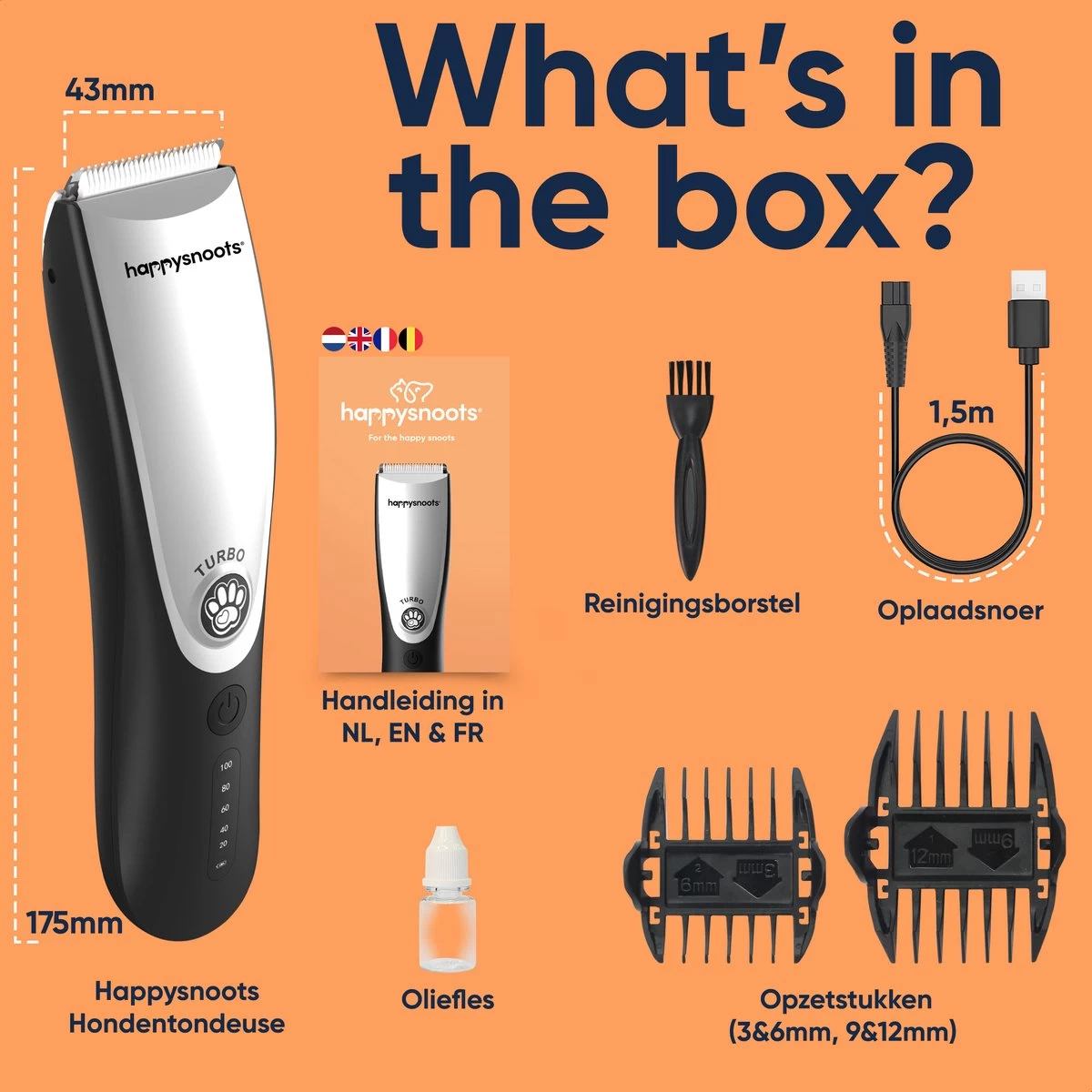 ➽ VOOR ELK VACHTTYPE: De Happysnoots Pet Trimmer wordt geleverd met 2 verschillende opzetstukjes zodat je de juiste kam kunt gebruiken voor de juiste vacht en lengte. De aangeboden kammen variëren van 3 tot 12 mm (4 lengtes).