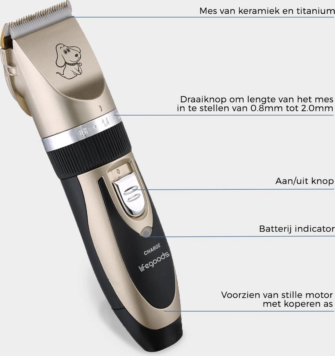 Het belangrijkste voor een fijn resultaat is dat jouw huisdier zich fijn voelt tijdens de trimbeurt. Dankzij de krachtige precisie motor van de LifeGoods dierentondeuse maakt deze enkel een zacht geluid en is de vibratie minimaal (onder de 50 decibel). Kortom een dierentondeuse met een betrouwbaar en stil gebruik.
