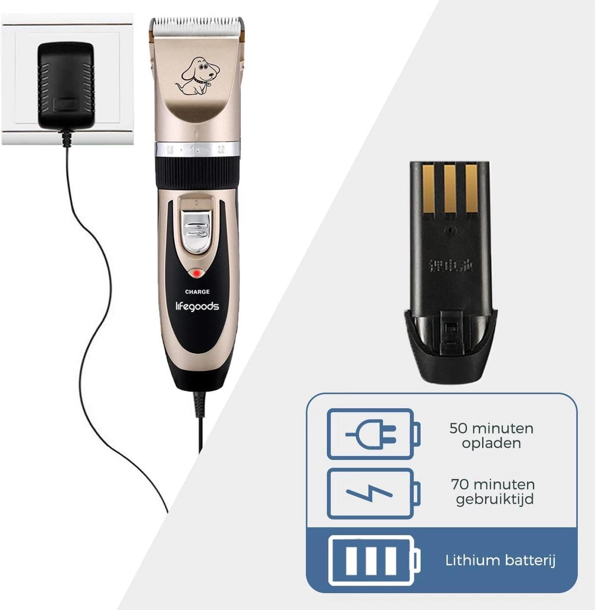 De LifeGoods dierentondeuse wordt geleverd met 4 verschillende opzetkammen zodat je de juiste kam kunt gebruiken voor de juiste vacht en lengte. De bijgeleverde kammen variëren van 3 tot 12 mm. Tevens heeft de tondeuse vijf verschillende standen waarmee je kunt bepalen welke lengte van de vacht wordt afgeschoren. Indien je huisdier een extreem dikke vacht heeft of bijvoorbeeld extreem veel klitten kun je deze het best eerst kort knippen of ontklitten.
