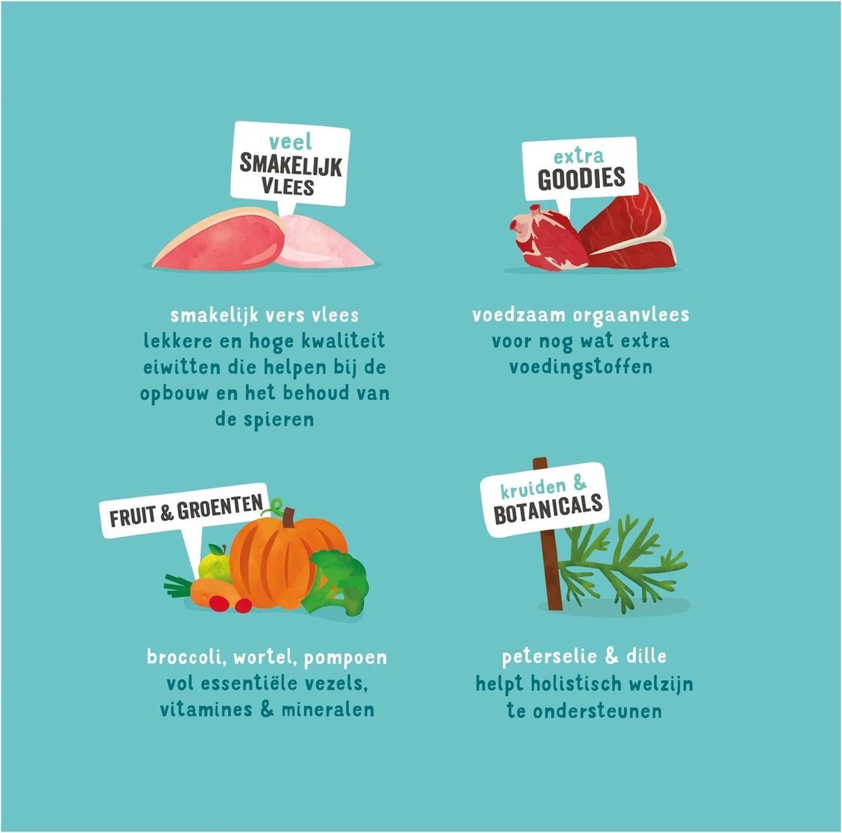 Samenstelling: wild 30%, eend 26%, mineralen, wortels 2%, bataten 1%, rode bieten 1%, cranberry’s 1%, appels 1%, peterselie 0,1%, dille 0,1%.