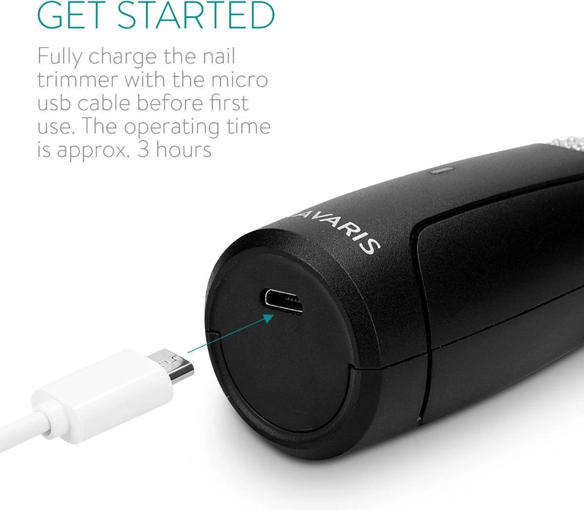 - Laad de vijl voor het eerste gebruik volledig op. De twee inbegrepen kapjes helpen bij het knippen van verschillende vormen en texturen nagels. Je kunt hem ongeveer 3 uur gebruiken voordat hij opnieuw opgeladen moet worden.