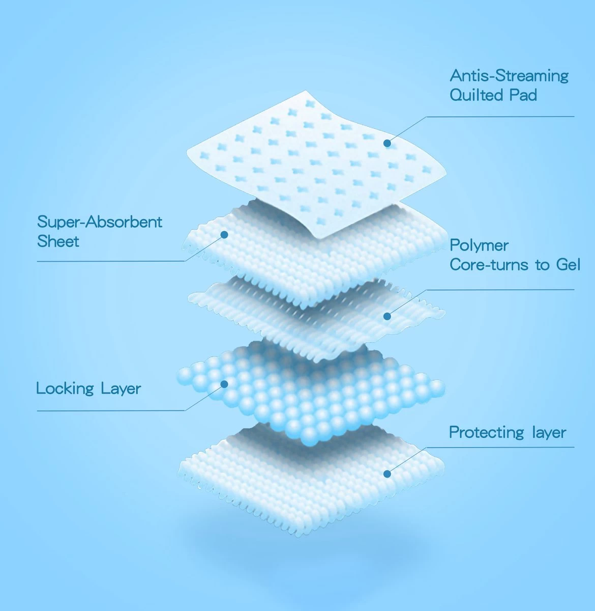 De pads hebben geavanceerde antibacteriële polymeertechnologie om snelle vloeistofabsorptie en snelle droging te garanderen. Deze pads absorberen tot 4 kopjes vloeistof en blokkeren effectief vocht in de gel om lekken te voorkomen.