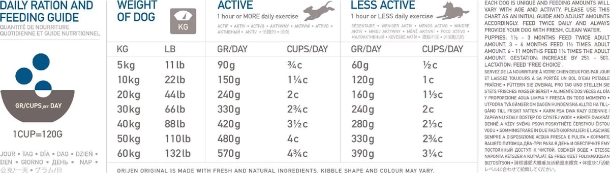 Orijen Whole Prey Original Dog 17 kgDe Orijen Whole Prey Original Dog 17 kg complete hondenvoeding is hondenvoer rijk aan scharrelkip en kalkoen, in het wild gevangen vis en scharreleieren in WholePrey verhoudingen. De natuurlijke voeding van Orijen bevat een ongeëvenaarde variatie aan vers vlees en verse vis. Het wordt bereid met 85% dierlijke ingrediënten en is 100% natuurlijk. Deze brokken bevatten hoogwaardige voedingsstoffen in de meest verse, natuurlijke en voedzame vorm. Maar liefst twee derde van het vlees, vis, gevogelte en eieren is vers of rauw.Volledig diervoeder voor honden. – Volledige hondenvoeding van Orijen- Met natuurlijke en verse ingrediënten- In Whole Prey verhoudingenInhoud: 17 kgSamenstelling:Vers kippenvlees (13%), Vers kalkoenvlees (7%), Verse hele eieren (7%), Verse kippenlevertjes (6%), Verse hele haring (6%), Verse Pacifische Pijltandheilbot (5%), Verse kalkoenlever (5%),