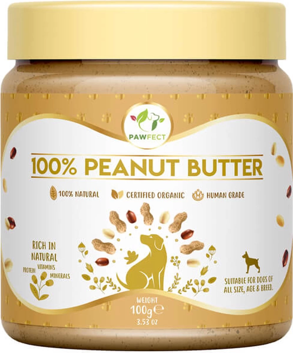 | Voedingswaarde | Pawfect Pindakaas voor de hond Naturel 100 gr. Deze speciaal voor honden ontwikkelde pindakaas is gemaakt van 100% vers geroosterde pinda's zonder toegevoegd zout, suiker of olie. De hondenpindakaas kun je het beste voor gebruik even doorroeren. De dikke en romige structuur zorgt ervoor dat je deze voedzame snack perfect kunt gebruiken in likmatten en ander verrijkingsspeelgoed, maar is ook zeer geschikt om medicijnen in te verstoppen. Het is ook mogelijk om de pindakaas toe te voegen aan de maaltijd, voor een extra bron van eiwitten, gezonde vetten en vitamine B en E. Probeer ook eens één van de andere smaken! |