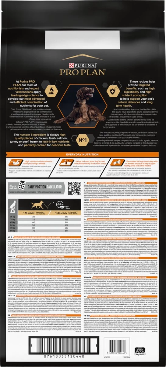 PURINA® PRO PLAN® Everyday Nutrition hondenvoer rijk aan kip draagt bij aan onderhoud van de dagelijkse gezondheid door het ondersteunen van gezonde gewrichten en een glanzende vacht van wortel tot punt. Bij PURINA PRO PLAN past ons team van voedingsdeskundigen en deskundige dierenartsen geavanceerde wetenschap toe om onze meest geavanceerde en efficiënte combinatie van voedingsstoffen voor jouw huisdier te ontwikkelen. Het nummer 1 ingrediënt is altijd stukken kip, lam, zalm, kalkoen of rundvlees van hoge kwaliteit, ingevroren om belangrijke voedingsstoffen vast te houden en perfect gekookt voor een heerlijke smaak.