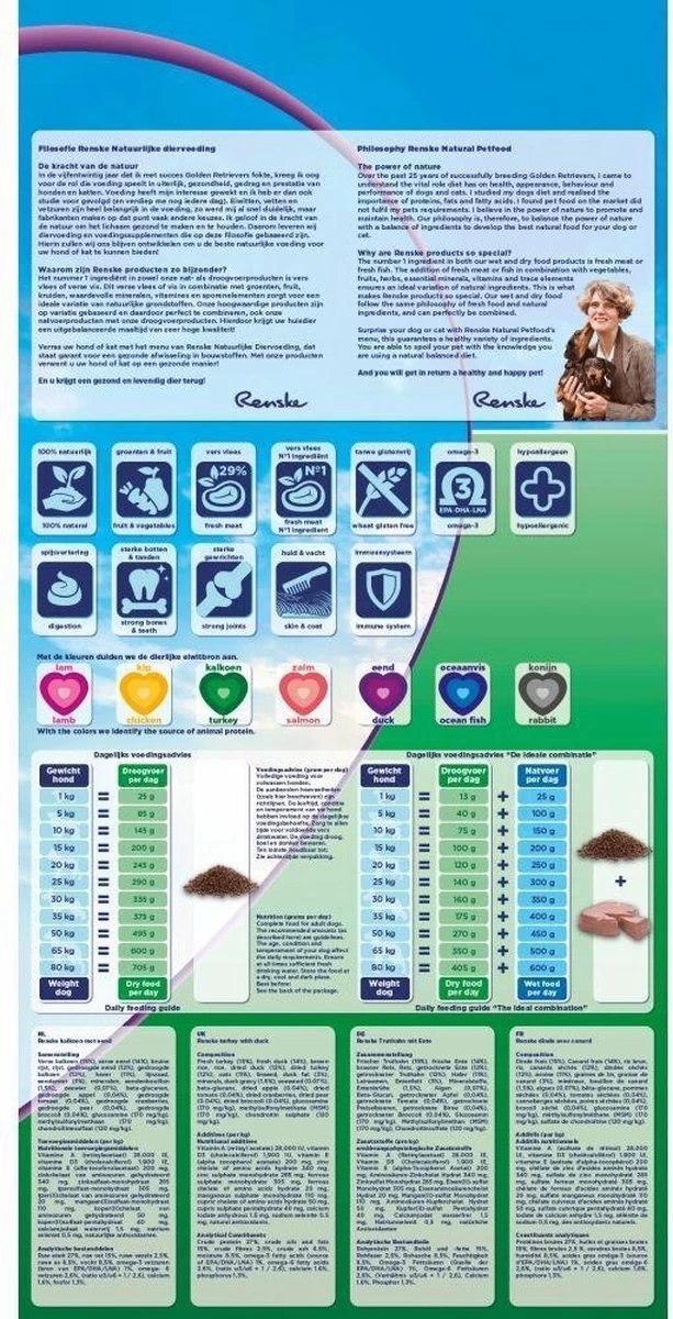 Renske Super Premium Adult – Kalkoen / EendEen complete voeding met verse kalkoen & eend.Geschikt voor volwassen honden van alle rassen.Voor een gezond immuunsysteem en voor regelmatige, stevige ontlasting.
