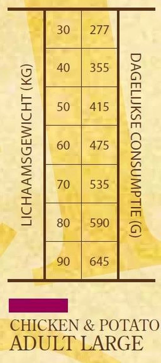 | Analytische bestandsdelen | COMPLETE RECEPTUUR VOOR VOLWASSEN HONDEN VAN GROTE RASSEN GEZONDHEID GEWRICHT & KRAAKBEEN Glucosamine + chondroïtine vooreen goede ontwikkeling van gewrichten kraakbeen GEZONDE STOFWISSELING Pre-biotica (mannan-oligo, en fructo-oligosacchariden) voor de gezondheid van het maag-darmstelsel HOGE VERTEERBAARHEID Verse kip voor een uitstekende verteerbaarheid IMMUNITEIT Groenten & fruit voor verbetering van immuniteit VERSE KIP & AARDAPPEL VOLWASSEN LARGE MET NAME GESCHIKT VOOR GROTE EN ZEERGROTE RASSEN |