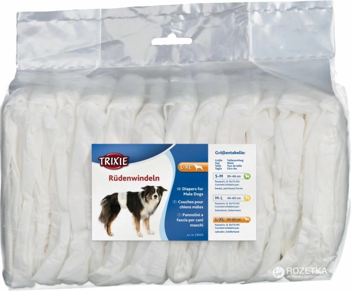 Deze hondenluiers van Trixie zijn ideaal voor eenmalig gebruik bij reuen. De luiers gemaakt in de vorm van een buikband en laten de achterzijde van de hond dus vrij. Ze zijn sterk absorberend en gaan lekken tegen. Door de elastische band en de klittenbandsluitingen zijn ze goed vast te maken. De luiers zijn wegwerpartikelen en na gebruik dus simpelweg te vervangen door een nieuwe.