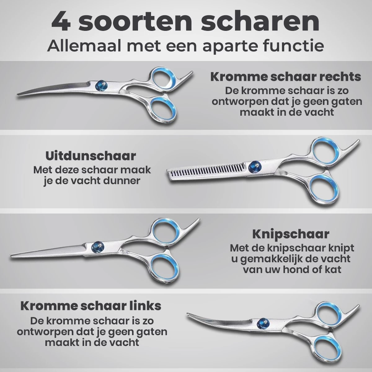 Er zitten 4 verschillende scharen in de set om verschillende modellen te kunnen knippen.